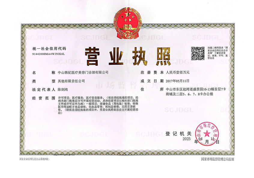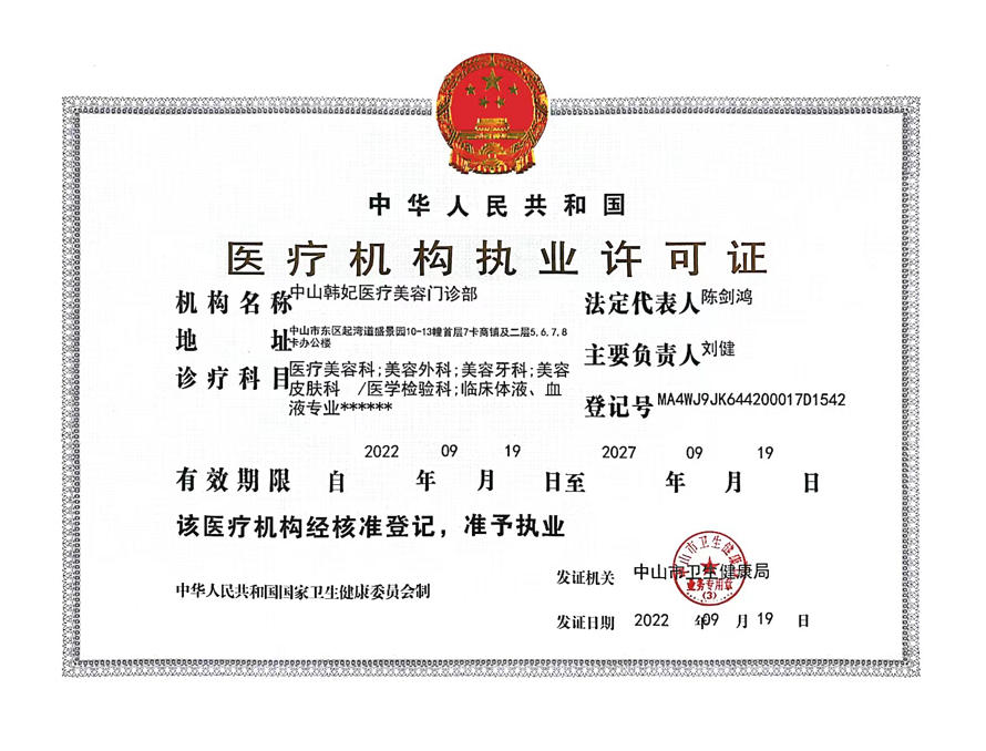 1. 单位名称:中山韩妃医疗美容门诊部有限公司